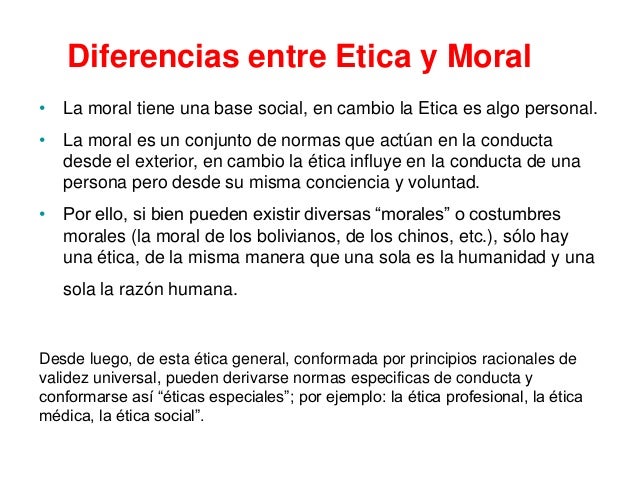 • Por ello, si bien pueden existir diversas “morales” o costumbres morales (la moral de los bolivianos, de los chinos, etc.), sólo hay una ética, de la misma manera que una sola es la humanidad y una sola la razón humana. Desde luego, de esta ética general, conformada por principios racionales de validez universal, pueden derivarse normas especificas de conducta y conformarse así “éticas especiales”; por ejemplo: la ética profesional, la ética médica, la ética social”.